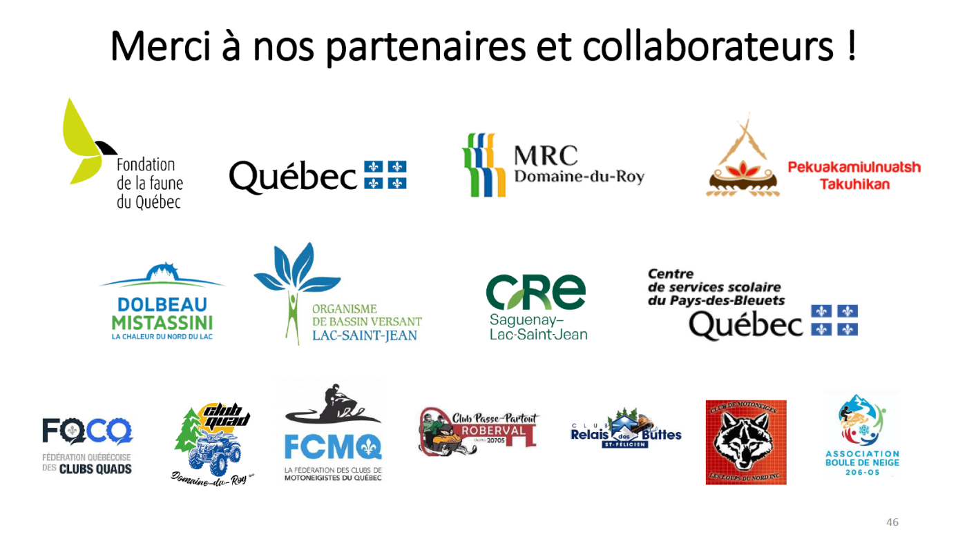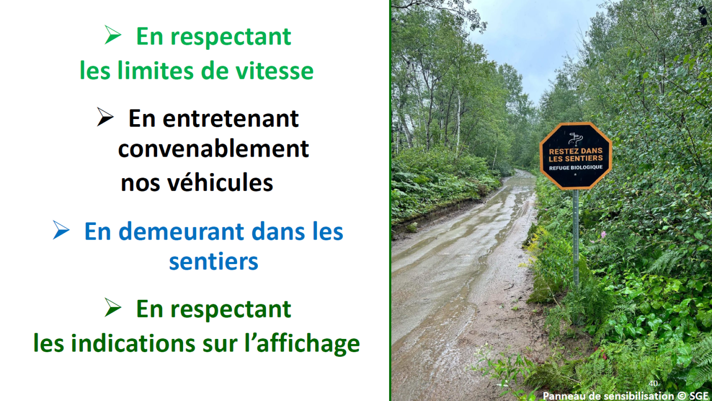 Cette formation vise à sensibiliser tous les utilisateurs de VHR à la protection des milieux naturels. Nous décrivons les lois qui protègent les milieux naturels. Nous répondons aux questions: les milieux humides et hydriques c’est quoi, ils servent à quoi, qu’est-ce qui les menace et comment faire pour les protéger. Nous présentons les différentes espèces fauniques et floristiques qu’on retrouvent sur le territoire et ceux qui ont un statut précaire. Nous présentons les outils de sensibilisation qui existent sur le territoire comme la Route des milieux humides et ceux que nous avons créés, comme des capsules sur les réseaux sociaux et de l’affichage que l’on retrouve dans les sentiers (panneaux signalétiques) de VHR et dans plusieurs relais (cartes didactiques) au Lac-Saint-Jean.